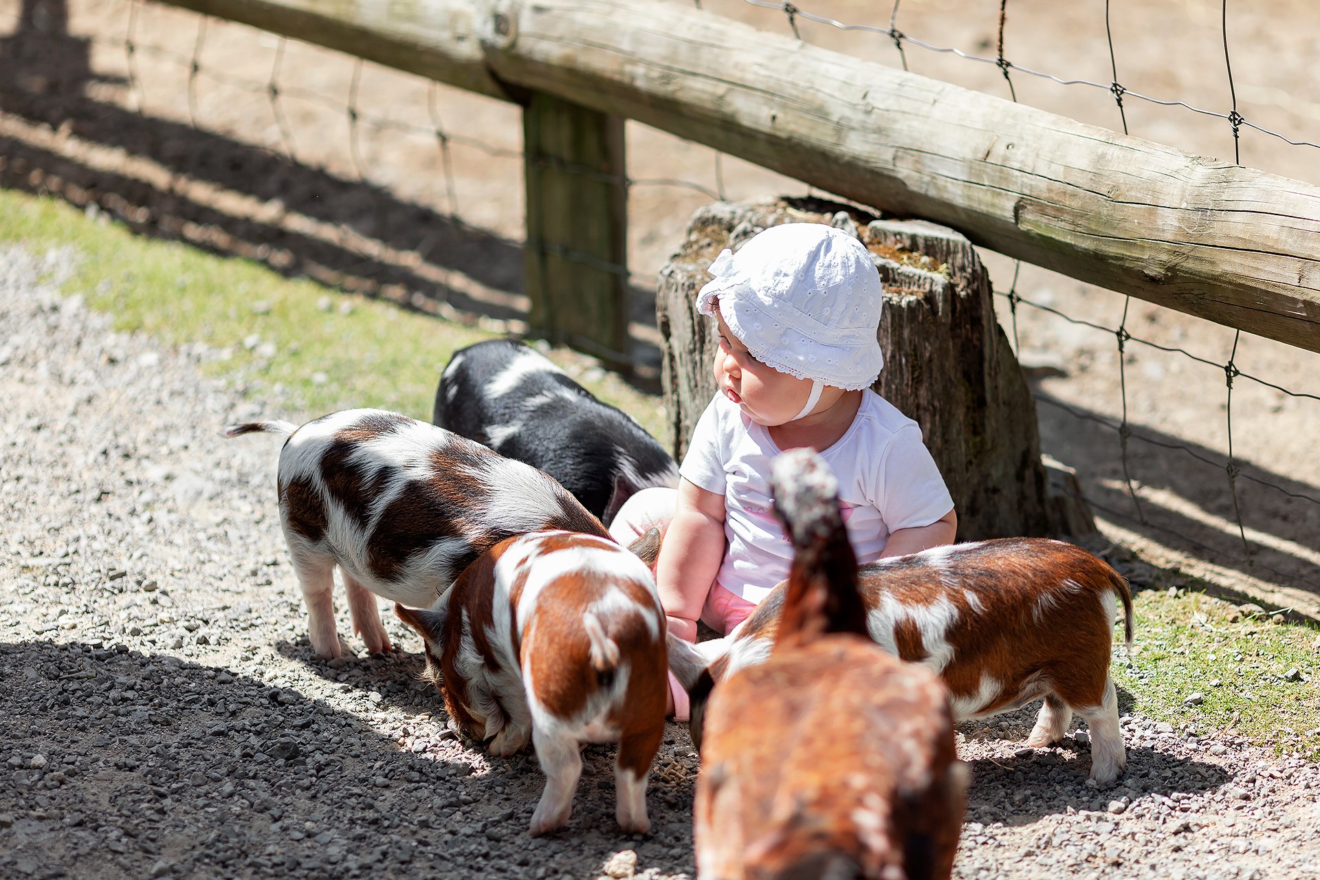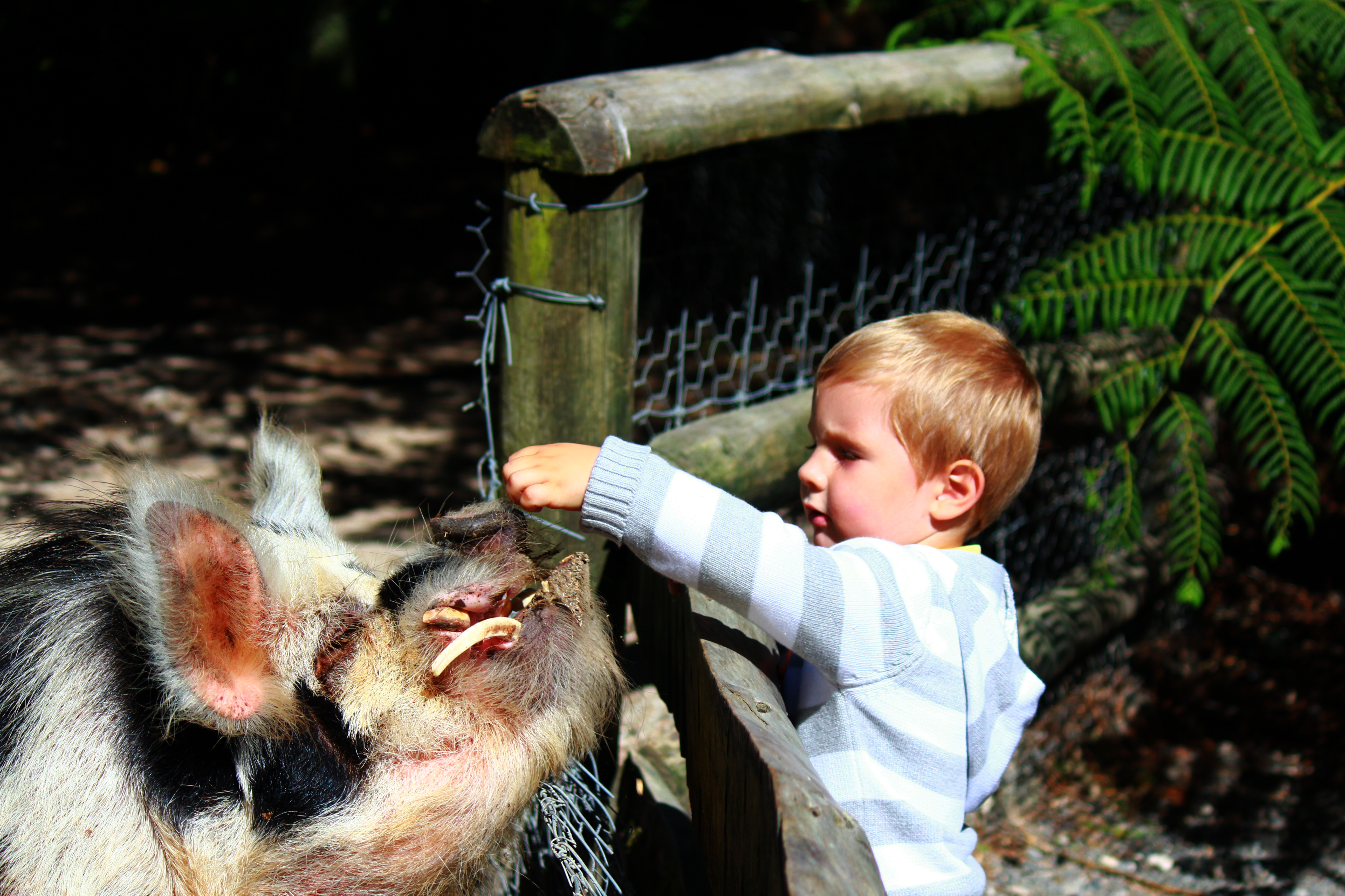 Our enclosure here at our Wellington farm park has an elevated walkway from where you can view the pigs roaming around in their bush setting.